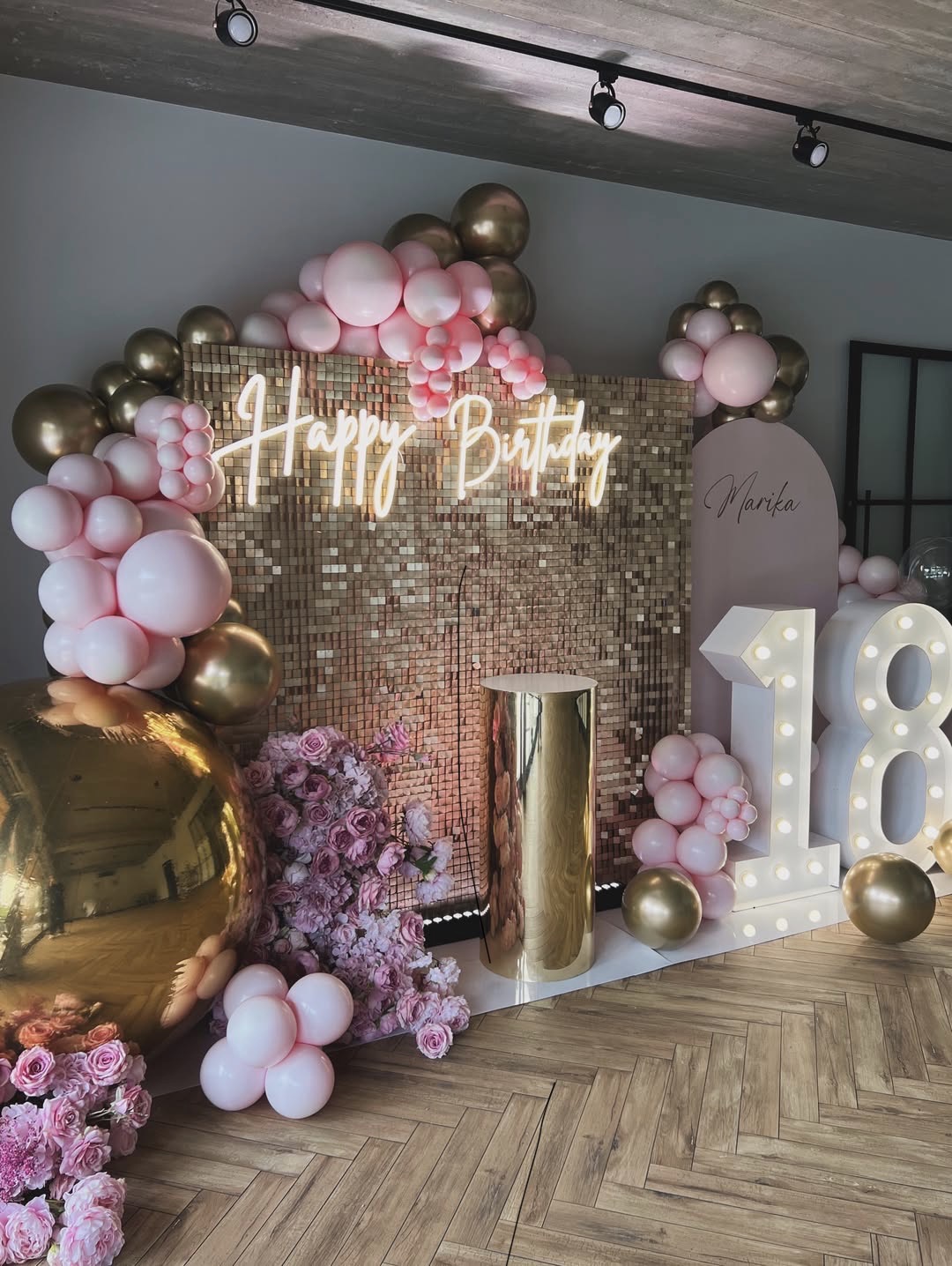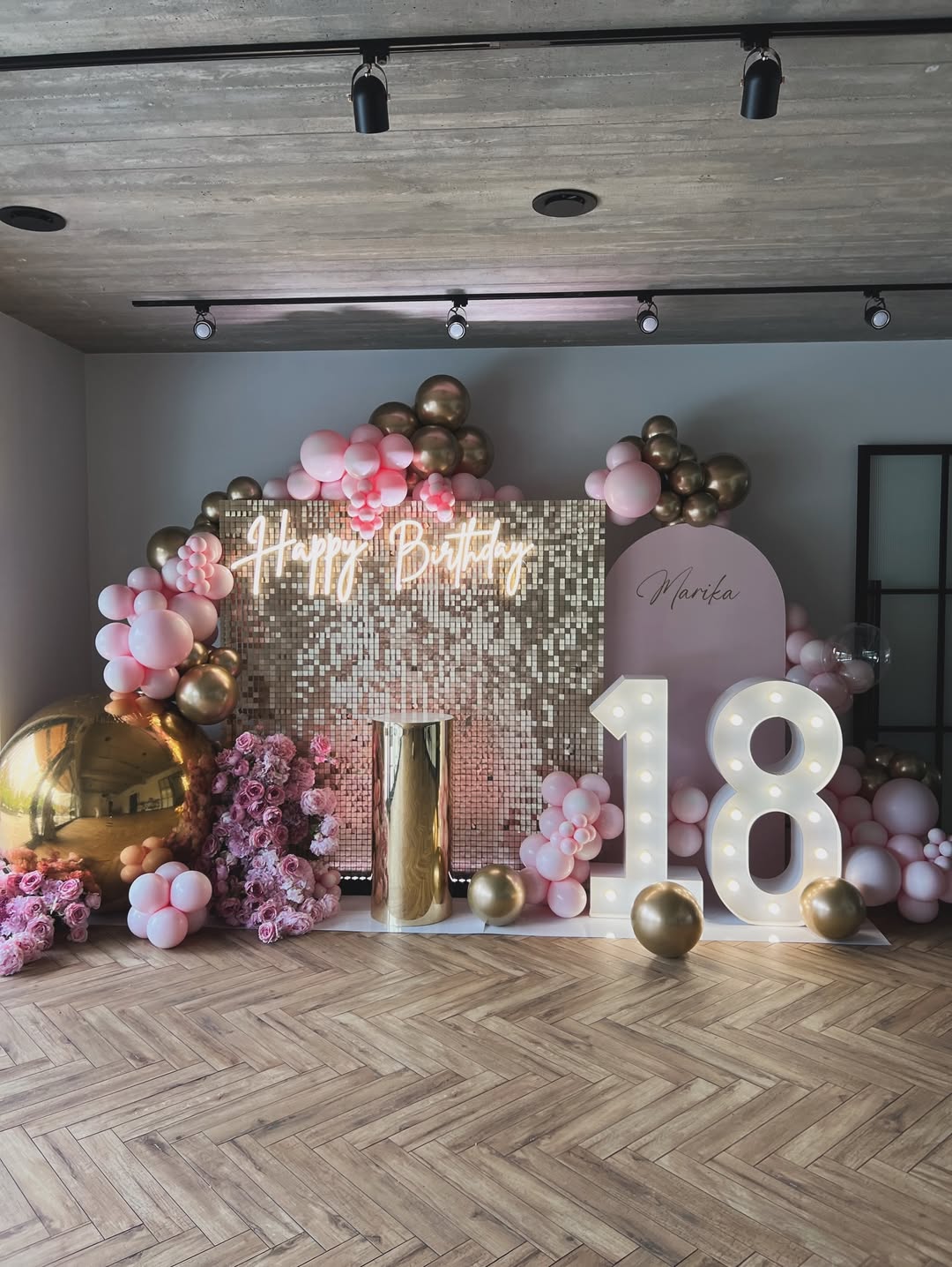 Cea mai cerută variantă de decor pentru petrecerile de 18 ani este zona foto formată din cifre „18” din baloane folie, combinate cu panouri decorative SolaAir și accente moderne precum neonul „Happy Birthday” sau mesaje personalizate.