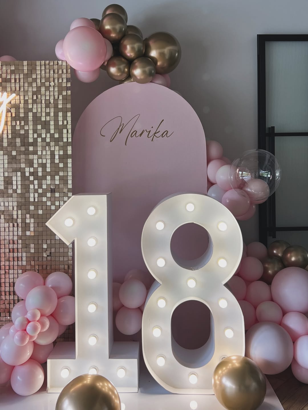 Cifrele „18” din baloane folie oferă un punct focal clar, ușor de recunoscut și extrem de fotogenic. Combinația dintre cifrele aniversare, panourile SolaAir și o ghirlandă sau arcadă de baloane latex creează un decor complet, modern și memorabil, potrivit atât pentru petreceri glam, cât și pentru majorate cu vibe party sau minimalist.