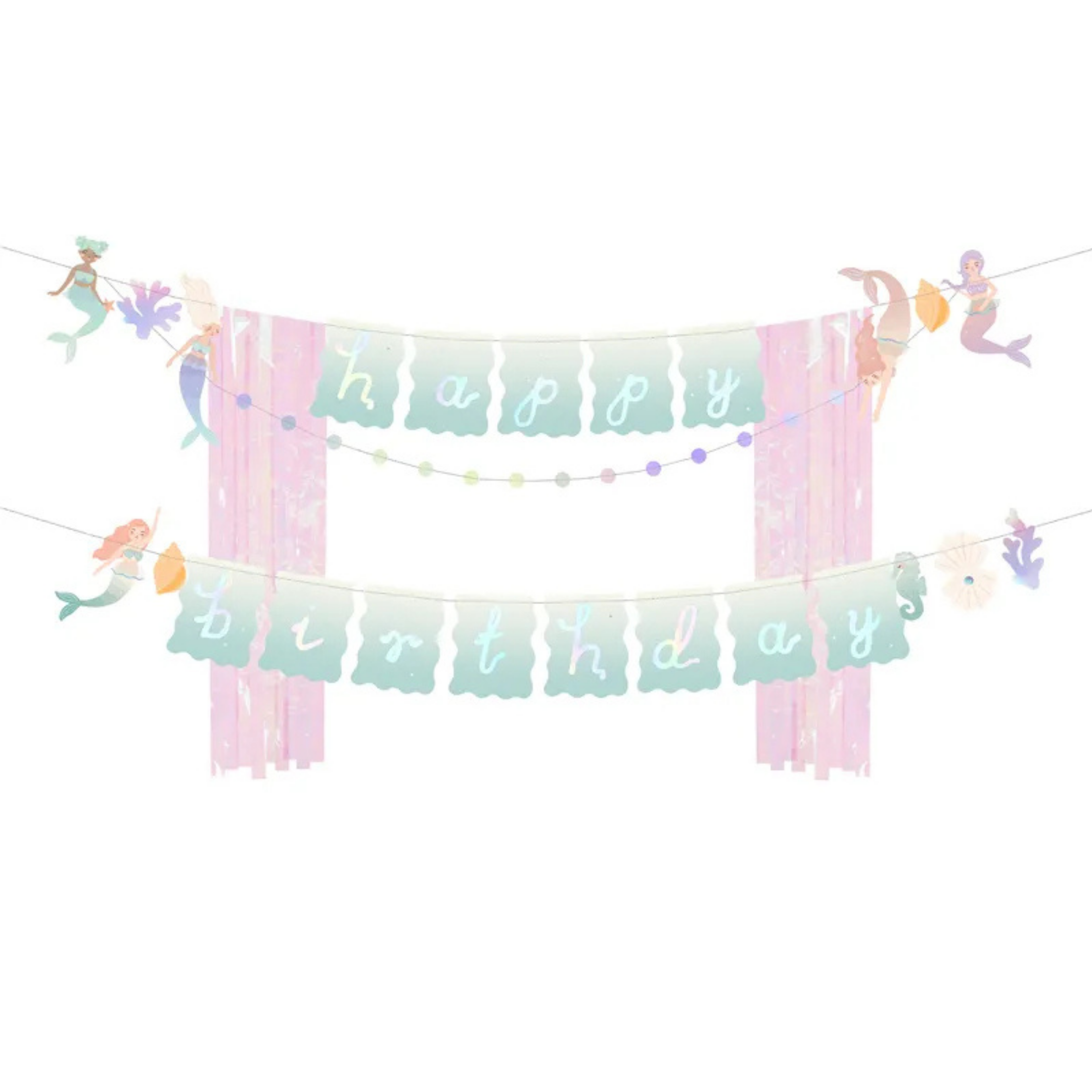 Banner Happy Birthday decorat cu franjuri roz si iridescent, tematica Sirene.