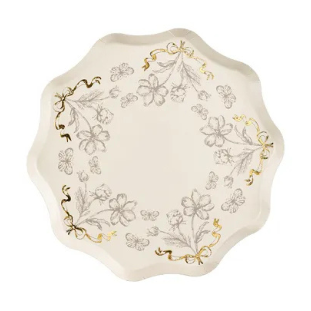 Farfurii din carton, de culoare bej, decorate cu flori în nuanțe de bej închis și imprimeu auriu strălucitor – elegante și versatile, ideale pentru petreceri rafinate.